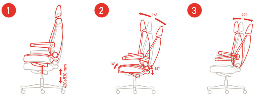 Both backrest and seat can be independently adjusted. The seat can be adjusted in depth within a 100mm range, while backrest can be independently adjusted in a 22 degrees range moving front and backwards.